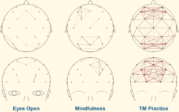 Los patrones de ondas cerebrales de la MT y el mindfulness son completamente diferentes. El monitoreo abierto o mindfulness crea conexiones no globales de coherencia EEG en el cerebro. La técnica MT, por otro lado, produce una coherencia global de ondas cerebrales. Esta es la base de los muchos cambios positivos en el pensamiento, el habla y el comportamiento, así como también la influencia de la coherencia que experimenta la sociedad como un todo.
